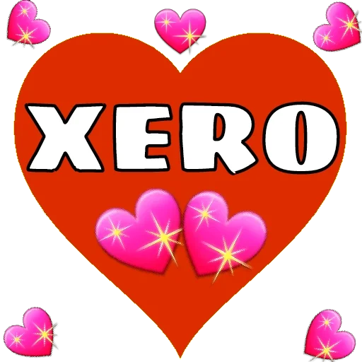 Um coração vermelho grande com a palavra 'XERO' em letras brancas. Corações rosê pequenos com estrelas douradas ao redor.