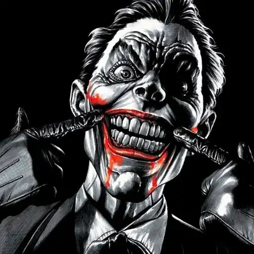 O Coringa com uma expressão de loucura, mostrando os dentes e com sangue na boca, enquanto segura uma faca em cada lado da cabeça.