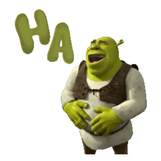 Shrek ri com a palavra 'HA' em verde ao lado esquerdo.