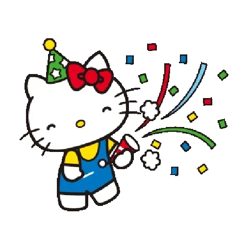 Rosto de Hello Kitty com um laço rosa, fazendo um gesto com a mão e com dois triângulos rosas atrás da cabeça.