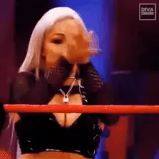 Uma mulher loira com roupas de luta livre em um ringue de luta, com cordas azuis e rosadas, em frente a uma plateia.