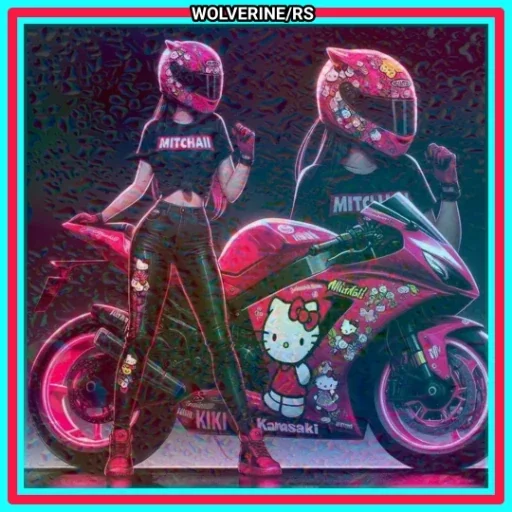 Uma mulher e um homem com capacetes de moto ao lado de uma moto rosa com Hello Kitty. Eles vestem roupas pretas e rosas.