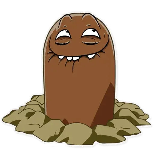 Um verme de terra marrom com olhos e dentes, saindo da terra com um sorriso engraçado.