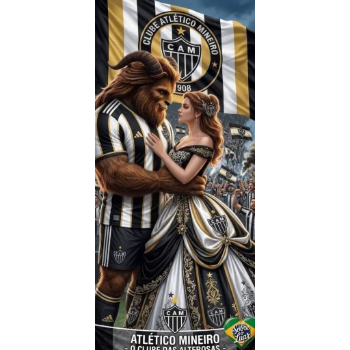 Um homem com características de lobo, vestindo uma camisa de futebol listrada em preto e branco, abraça uma mulher de vestido longo e elegante. Ao fundo, há uma bandeira com listras pretas e brancas e um escudo.