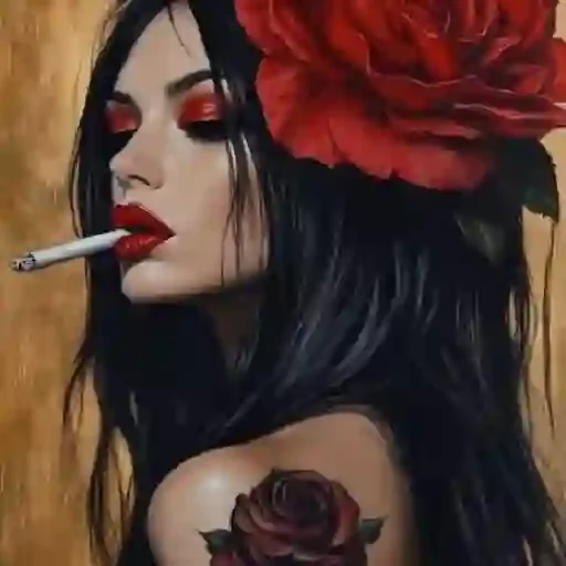 Mulher com longos cabelos pretos, olhos vermelhos, lábios vermelhos e uma rosa vermelha no cabelo, fumando um cigarro. Ela tem uma rosa tatuada no ombro.