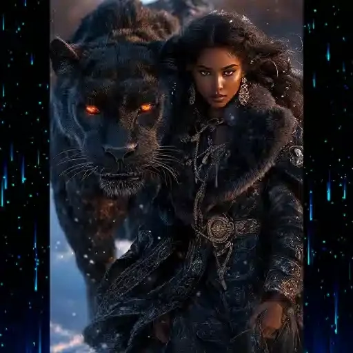 Uma mulher com cabelos castanhos e olhos sérios está ao lado de um grande tigre preto com olhos laranja. Ela veste uma roupa escura com detalhes em pele.