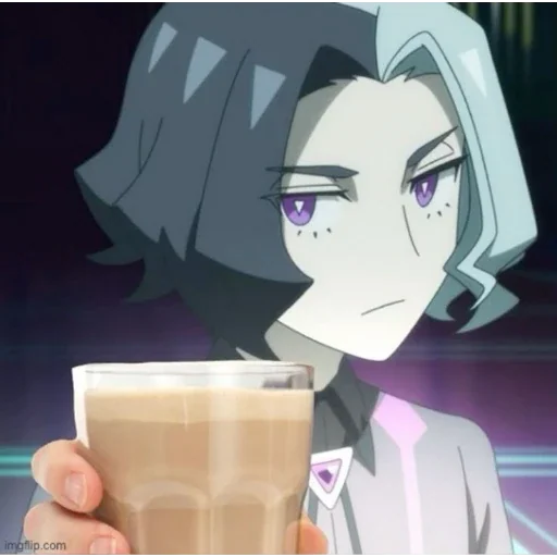 Personagem de anime com cabelo cinza e roupa branca olhando para o lado com uma xícara de café na mão.