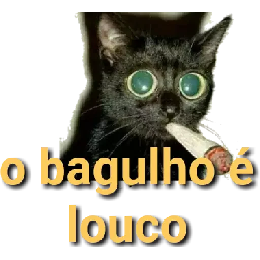 Gato preto com olhos grandes e esbugalhados, comendo um pedaço de queijo. O texto 'o bagulho é louco' aparece embaixo.