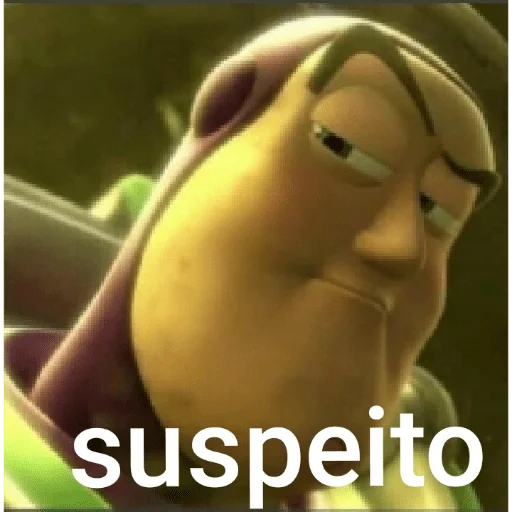 Personagem de anime com expressão de desconfiança, olhos estreitos e testa franzida. O texto 'suspeito' está escrito em branco na parte inferior.