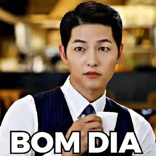 Homem asiático com cabelo preto, usando um colete preto e gravata, segurando uma xícara de café e olhando para frente com uma expressão neutra. Sobreposto, o texto 'BOM DIA' em letras grandes e brancas.
