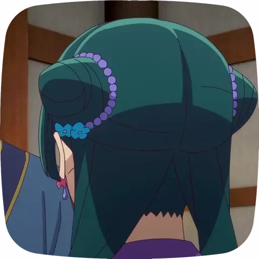 Uma personagem de anime com cabelo preto e um chapéu verde, com adornos roxos e azuis.