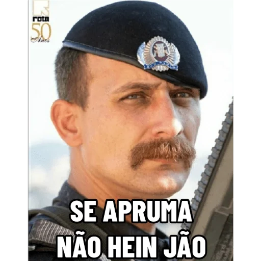 Um homem com bigode e uniforme militar olha para o lado, com uma expressão séria. Ele usa um quepe com um brasão e há texto embaixo: 'SE APRUMA NÃO HEIN JÃO'