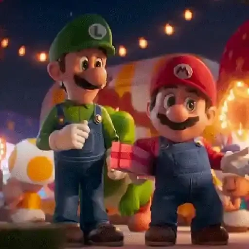 Dois personagens de Mario, um de verde e outro de vermelho, com bigodes e macacões azuis, em frente a uma cena colorida noturna com luzes.