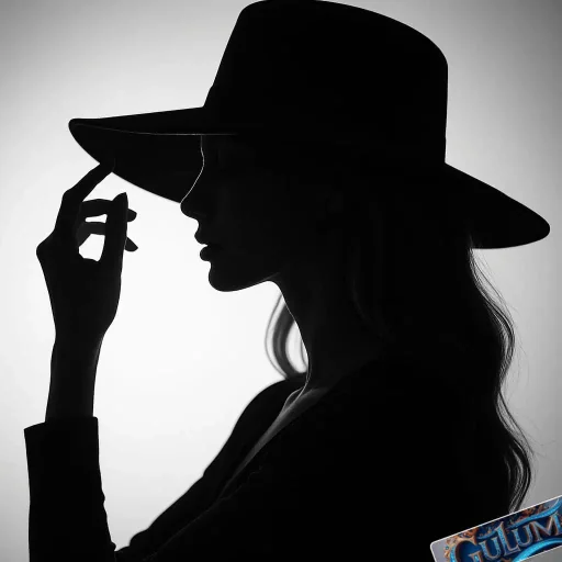 Silueta de mulher de chapéu contra fundo cinza, tocando o chapéu com a mão.