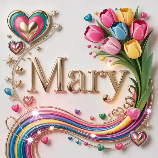 Um desenho colorido com o nome 'Mary' no centro, rodeado de corações, tulipas e uma faixa arco-íris. O fundo é branco com detalhes em dourado.