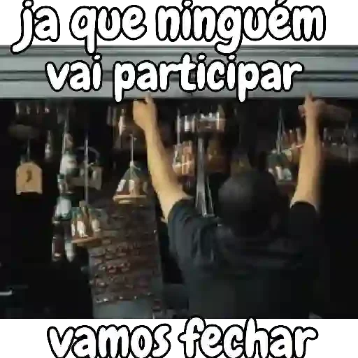 Um homem de costas, com as mãos levantadas, em frente a uma prateleira de garrafas. Sobreposto, o texto "já que ninguém vai participar vamos fechar".