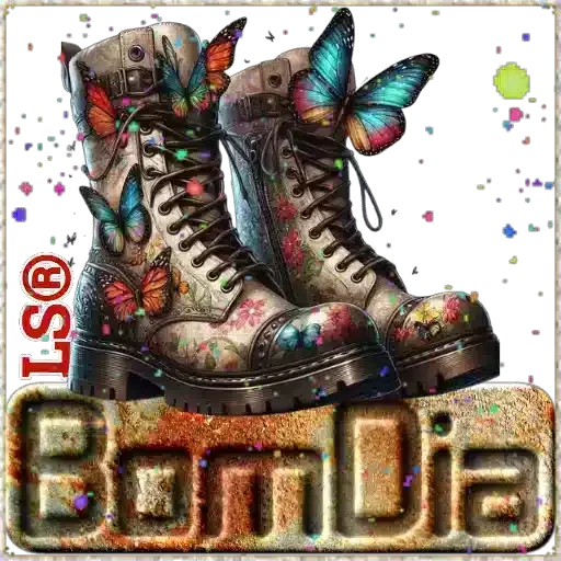 Um par de botas roxas decoradas com borboletas e flores, com a frase 'BomDia' em letras roxas acima delas.