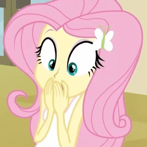 Uma potranca de pelo rosa com um laço branco no cabelo e olhos azuis, com as mãos sobre a boca em uma expressão de surpresa ou choque.