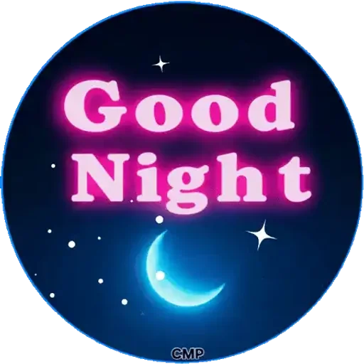 Uma lua crescente azul e estrelas em um fundo noturno escuro com o texto "Good Night" em letras rosa.