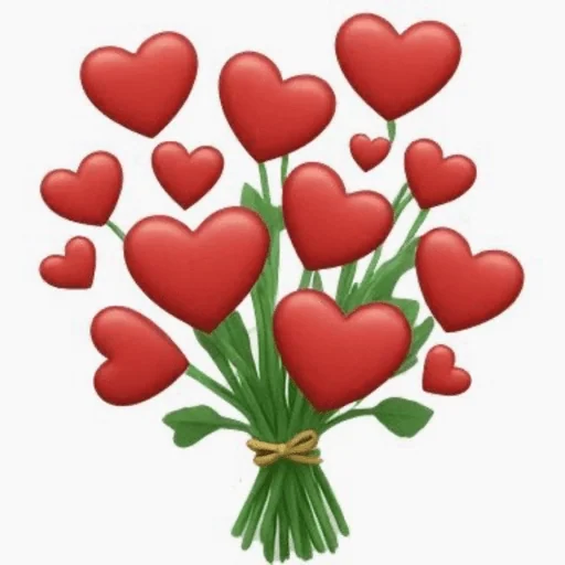 Um buquê de corações vermelhos grandes e pequenos, atados com um laço de palha.