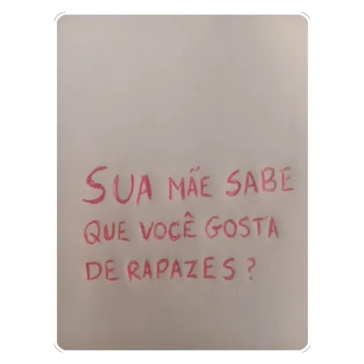 Um retângulo bege com texto em vermelho escrito 'SUA MÃE SABE QUE VOCÊ GOSTA DE RAPAZES?'
