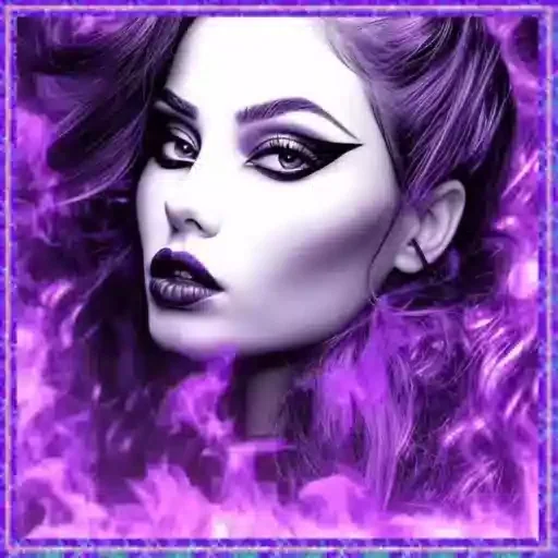 Rosto de uma mulher com olhos roxos brilhantes e cabelos longos e escuros, expressão séria e misteriosa.