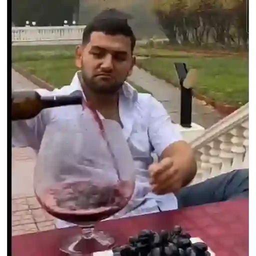 Um homem de barba e cabelo curto, com uma camisa branca, está sentado à mesa, bebendo vinho tinto de uma taça grande. Ele parece estar em um ambiente externo com grama e árvores ao fundo.