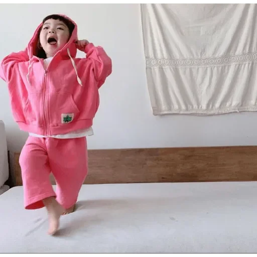 Menina asiática usando um pijama rosa, com capuz, pulando em uma cama com expressão de surpresa ou alegria.