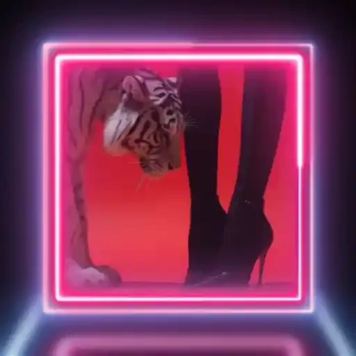 Uma mão segurando uma carteira de dinheiro em frente a pernas femininas com salto alto, dentro de um retângulo rosa neon.