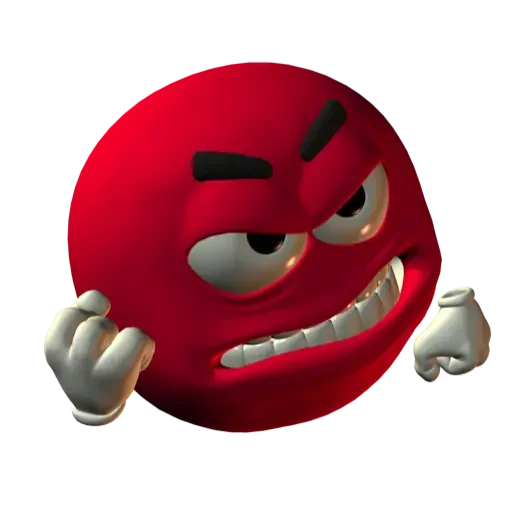 Uma esfera vermelha com expressão facial zangada e mãos brancas ao lado do corpo, com um sorriso malicioso.