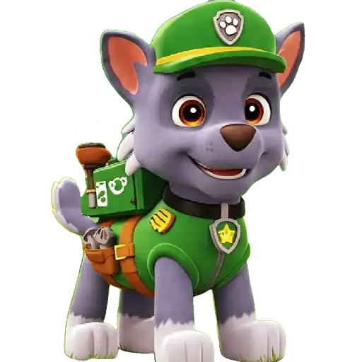 Um cachorro cinza com orelhas grandes e um chapéu verde, parte do uniforme de um grupo de resgate, com uma mochila e um crachá.