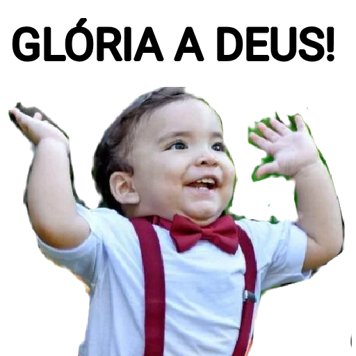 Menino com as mãos levantadas e expressão de alegria, vestindo uma camisa branca, suspensórios vermelhos e uma gravata borboleta vermelha, com o texto 'GLÓRIA A DEUS!' acima dele.
