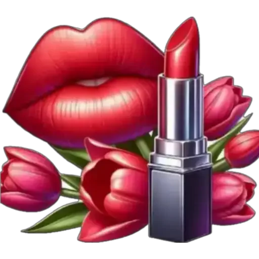 Um batom vermelho brilhante ao lado de uma boca com lábios pintados de vermelho, rodeados de tulipas vermelhas.