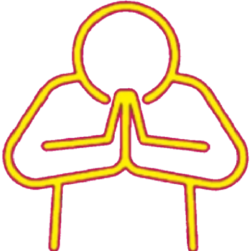 Uma figura humana com as mãos unidas em frente ao rosto, contornada em vermelho e preenchida em amarelo.