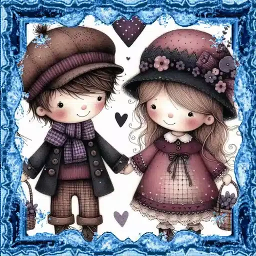 Um casal de crianças desenhadas com chapéu e roupas de inverno, segurando as mãos um do outro, com corações ao redor. O menino usa um casaco preto e o chapéu castanho, enquanto a menina usa um vestido rosa e um chapéu com flores.