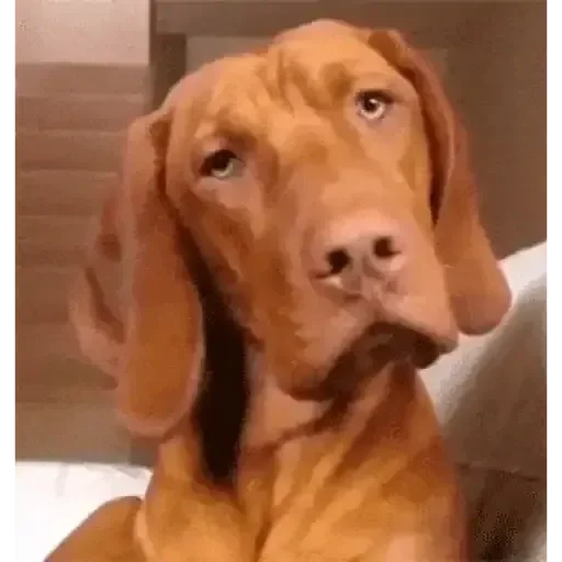 Um cachorro da raça Vizsla com expressão curiosa e orelhas caídas, deitado em uma superfície branca com uma parede de madeira ao fundo.