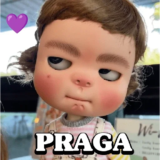 Rosto de uma menina com expressão triste, bochechas rosadas e olhos caídos. Ela tem o cabelo castanho e usa um vestido xadrez rosa. Há um coração roxo no canto superior esquerdo e o texto 'PRAGA' em letras brancas na parte inferior.