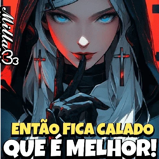 Uma mulher com cabelos grisalhos e olhos azuis, vestindo uma capa escura, faz um gesto de silêncio com o dedo indicador na frente da boca. No fundo, há um texto 'ENTÃO FICA CALADO QUE É MELHOR!' em letras amarelas e brancas.