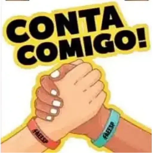 Duas mãos dadas, uma com pulseira laranja e a outra com pulseira azul, com o texto 'CONTA COMIGO!' em letras pretas acima.