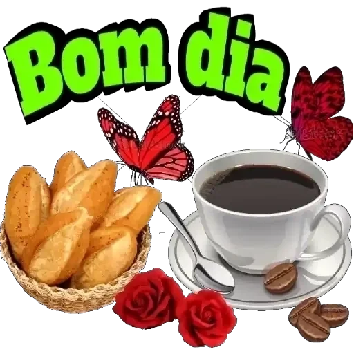 Um bule de café com pão francês, rosas vermelhas, borboletas e a frase 'Bom dia' em verde.
