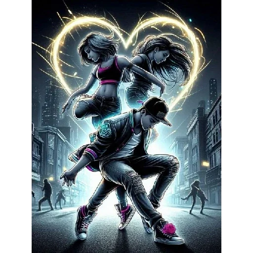 Um casal dançando em uma cidade noturna com um coração luminoso ao fundo. O homem está usando um boné e tênis rosa, enquanto a mulher tem cabelos longos e um look esportivo.