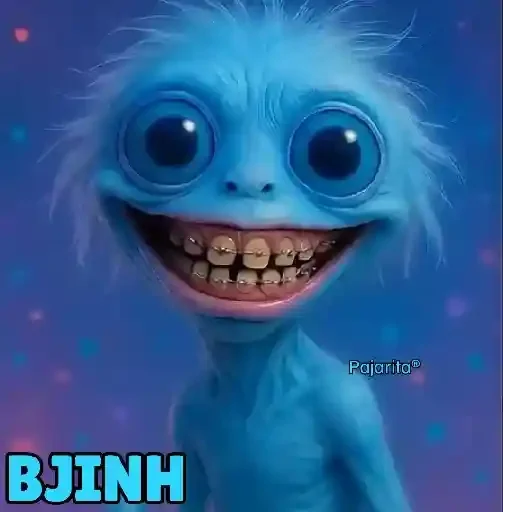 Um monstro azul com olhos grandes e cabelo desgrenhado, mostrando um sorriso com dentes separados. O fundo é roxo com pontos coloridos. 'BJINH' está escrito no canto inferior esquerdo.
