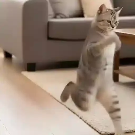 Gato cinza com listras pretas dançando em uma sala com sofá e mesa de madeira ao fundo. O gato tem a pata levantada.