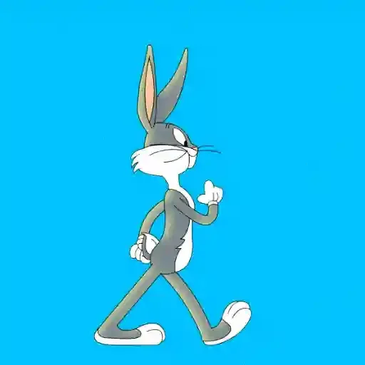 Bugs Bunny, o coelho cinza do desenho animado, caminhando e acenando com a mão direita, contra um fundo azul brilhante.