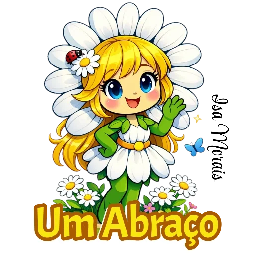 Uma menina de cabelos loiros com uma flor na cabeça e um vestido de flor, com o texto 'Um Abraço' embaixo. Ela tem um sorriso no rosto e uma mão levantada.