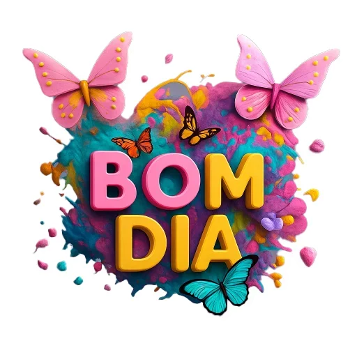 Um desenho colorido com as palavras 'BOM DIA' em letras grandes e rosadas e amarelas, com borboletas cor-de-rosa e azuis ao redor.