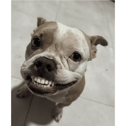 Cachorro sorrindo com dentes aparecendo, focinho preto e olhos castanhos. Fundo de piso branco.