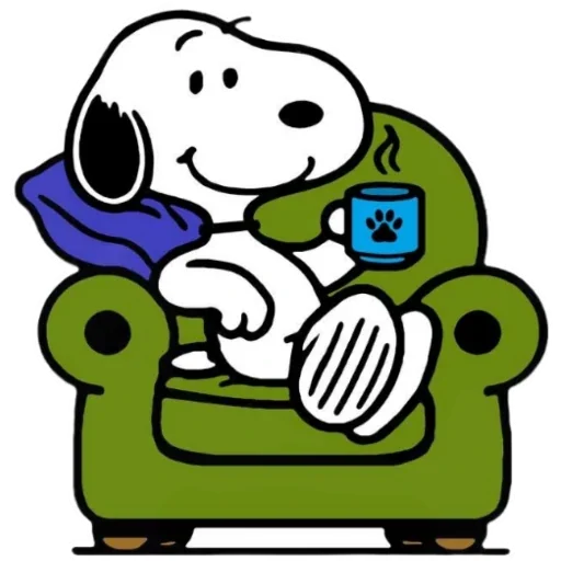 Snoopy sentado no sofá verde com um cobertor roxo, segurando uma xícara azul com uma pata de cachorro, com uma expressão feliz.