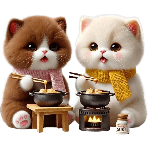 Dois gatos fofos, um castanho e um branco, sentados à mesa com pauzinhos, comendo de tigelas sobre fogareiros portáteis.