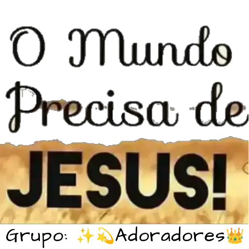 Uma imagem com texto 'O Mundo Precisa de JESUS!' em letras grandes e coloridas, com fundo branco e dourado. Inclui também a palavra 'Grupo: Adoradores' com emojis de fogos de artifício.